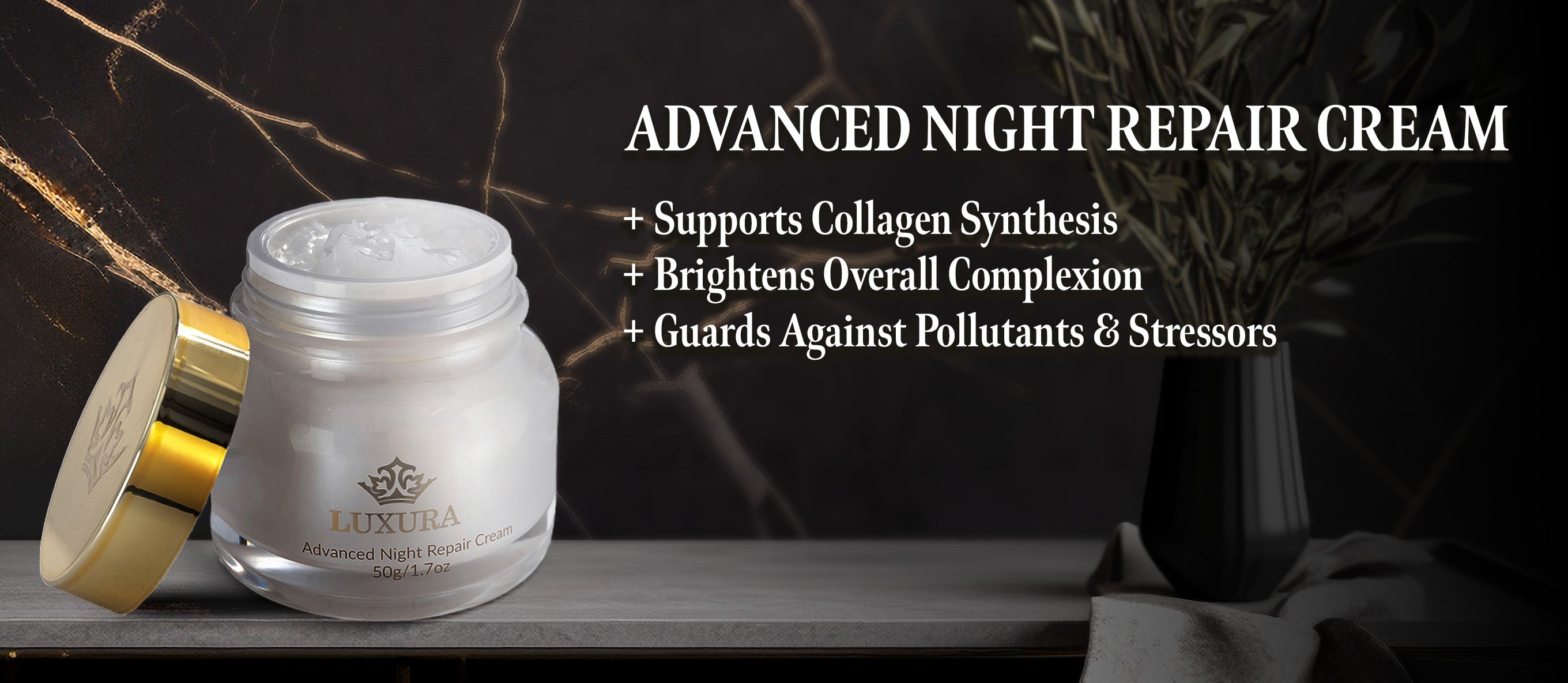 Infused with potent anti-aging properties of Hyaluronic Acid and Collagen, LUXURA's Advanced Night Repair Cream reverses the damaging effects of the day, deeply hydrates, reduces signs of aging, and promotes a radiant, youthful complexion.