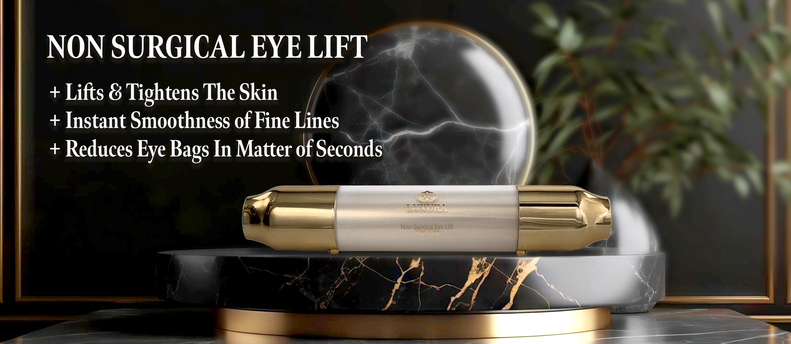 Experience the instant transformative power of LUXURA's Non-Surgical Eye Lift, designed to rejuvenate and lift the delicate skin around your eye area. This scientifically proven formula infuses Gold Flakes, Stem Cell Extracts, and Hyaluronic Acid to reduce the appearance of fine lines and wrinkles.